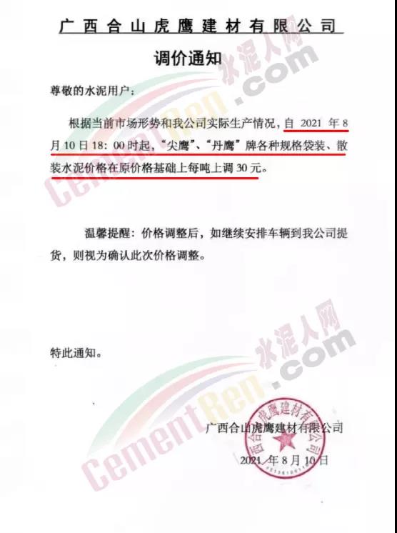 廣西合山虎鷹建材有限公司通知,自8月10日18時起“尖鷹”、“丹鷹”牌各種規格袋裝、散裝水泥價格在原價基礎上上調30元/噸。