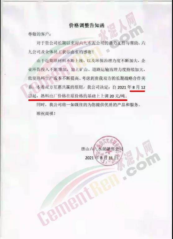 8月11日唐山六九水泥通知,由于近期原材料不斷上漲。以及環保治理力度不斷加大,企業環保投入不斷增加,加上礦山、道路運輸治理力度持續加大,致使熟料生產成本不斷提高。公司決定自8月12日起,熟料出廠價格在原價格的基礎上上調20元/噸。