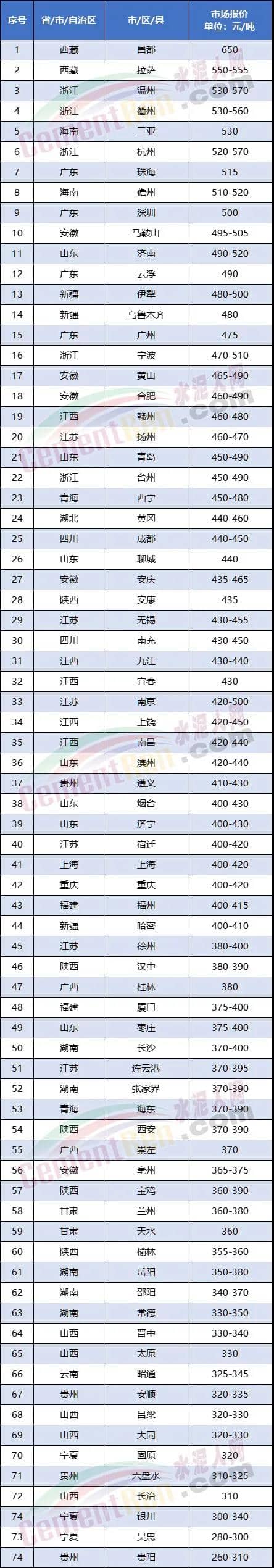 從水泥人網信息中心近期重點監控的的70多個區域市場報價來看,除西藏昌都報價650元/噸外,相對較高報價仍在浙江地區,浙江溫州最高報價達到570元/噸。