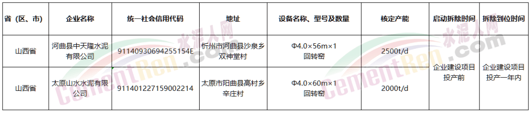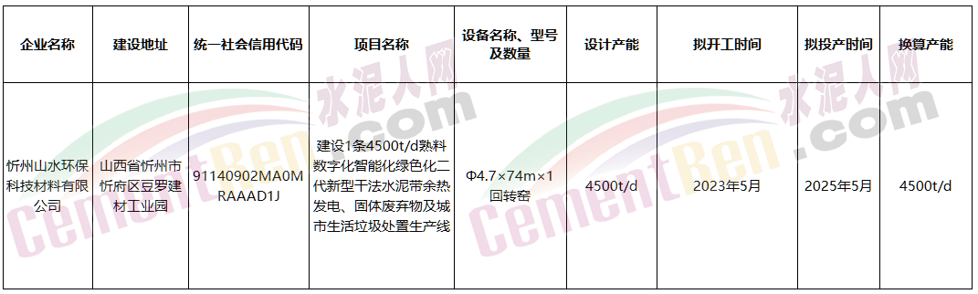 日前,山西省工業和信息化廳發布《山西山水水泥有限公司產能情況公示》提到:擬將山西河曲縣中天隆水泥有限公司2500t/d和太原山水水泥有限公司2000t/d水泥熟料產能將退出。用于忻州山水環保科技材料有限公司在山西省忻州市忻府區豆羅建材工業園建設1條4500t/d熟料數字化智能化綠色化二代新型干法水泥帶余熱發電、固體廢棄物及城市生活垃圾處置生產線。開工時間擬定為2023年5月,擬投產時間為2025年5月。 退出產能清況 建設項目情況