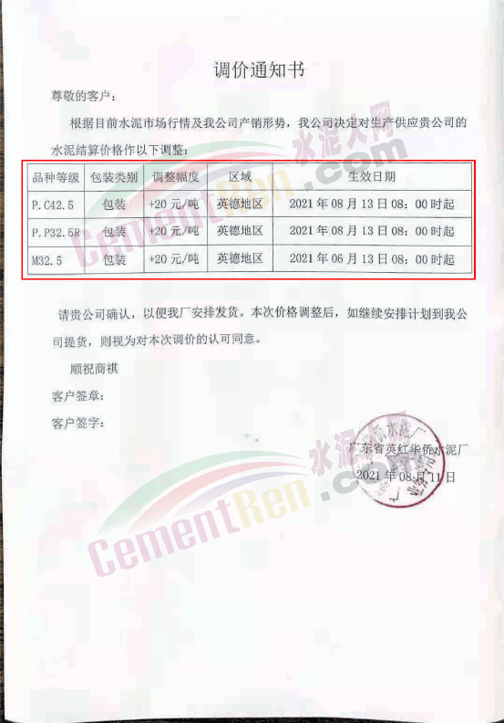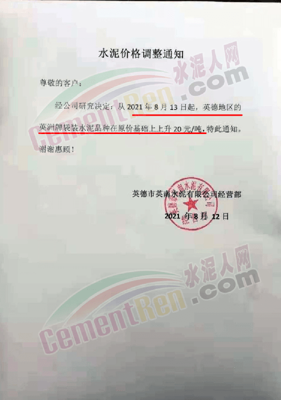 廣東省英紅華僑水泥廠通知,自8月13日8時起P.C42.5及P.P32.5R包裝水泥對英德地區(qū)上調(diào)20元/噸。