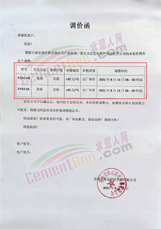 英德市金都水泥有限公司通知由于市場行情調(diào)整,材料不斷上漲,自8月13日起公司PO42.5R及PSA32.5R袋裝水泥價格在原有價格基礎(chǔ)上上調(diào)20元/噸。