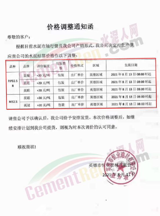 英德市恒業(yè)建材有限公司通知,自8月13日8時起旗下英翔、英冠、英聯(lián)品牌P.P32.5R包裝水泥及英聯(lián)、英冠品牌M32.5包裝水泥出廠價上調(diào)20元/噸。