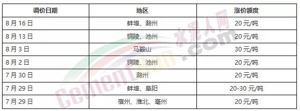 自7月下旬安徽滁州、蚌埠、蕪湖等多區(qū)域熟料價格率先上調(diào)15-30元/噸,帶動水泥價格上漲,多區(qū)域已經(jīng)連續(xù)兩輪上調(diào)價格,累計上調(diào)40-50元/噸。漲價后,省內(nèi)各企業(yè)報價在380-470元/噸,其中蚌埠海螺水泥PO42.5散裝水泥報價440元/噸,銅陵上峰水泥報價435元/噸,蕪湖海螺水泥報價470元/噸,宿州海螺、蕭縣天瑞報價380元/噸。