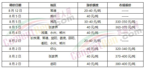 廣西區(qū)域主要品牌企業(yè)自8月10日起陸續(xù)通知水泥價格上調(diào)50元/噸。臺泥貴州水泥通知,于8月13日0時起,對全廣西區(qū)域的全品項水泥價格上調(diào)50元/噸。省內(nèi)主要品牌企業(yè)出廠報價在340-410元/噸之間。其中崇左紅獅、崇左南方水泥出廠報價340-350元/噸;桂林南方、興業(yè)海螺出廠報價390元/噸;華潤水泥各企業(yè)報價多在400元/噸左右。