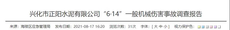 經(jīng)調(diào)查認(rèn)定,興化市正陽水泥有限公司“6.14”一般機械傷害事故是一起生產(chǎn)安全責(zé)任事故。