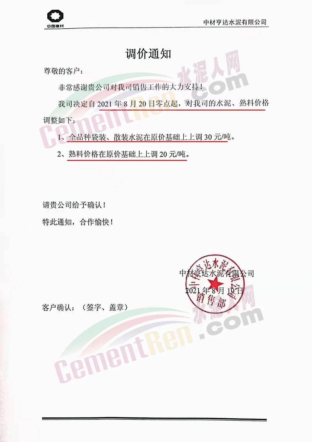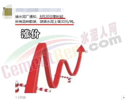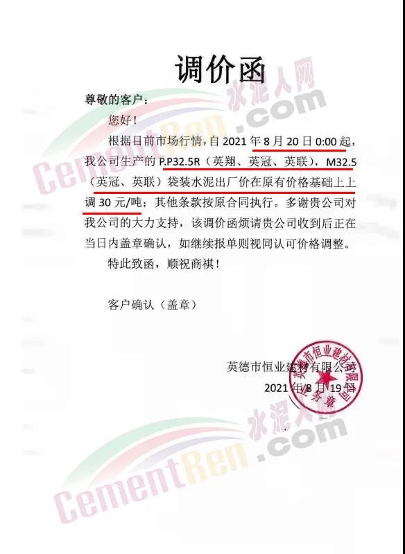 英德市恒業建材有限公司通知,8月20日0時起,旗下各標號水泥出廠價上調30元/噸。