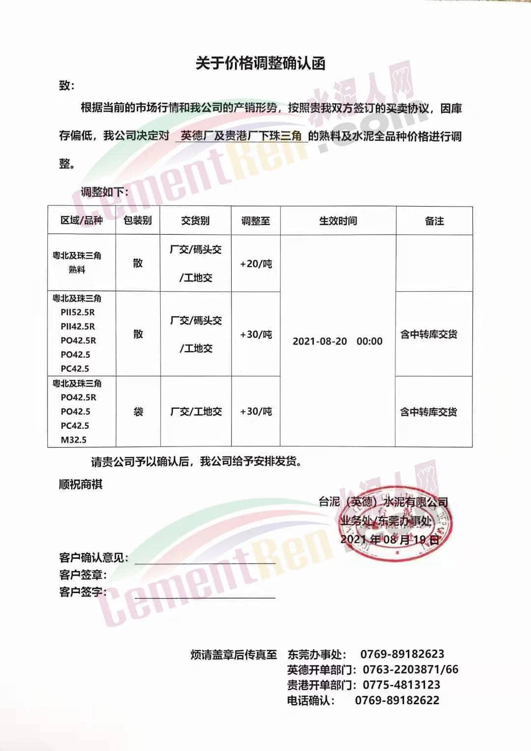 臺泥(英德)水泥有限公司通知,對英德廠及貴港廠下珠三角的熟料及水泥全品種價格進行調整。熟料漲20元/噸,各標號水泥袋裝及散裝漲30元/噸。