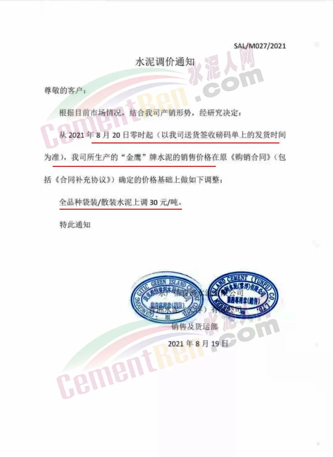 青洲水泥通知自8月20日0時起,公司“金鷹”牌水泥價格全品種袋裝,散裝上調30元/噸。