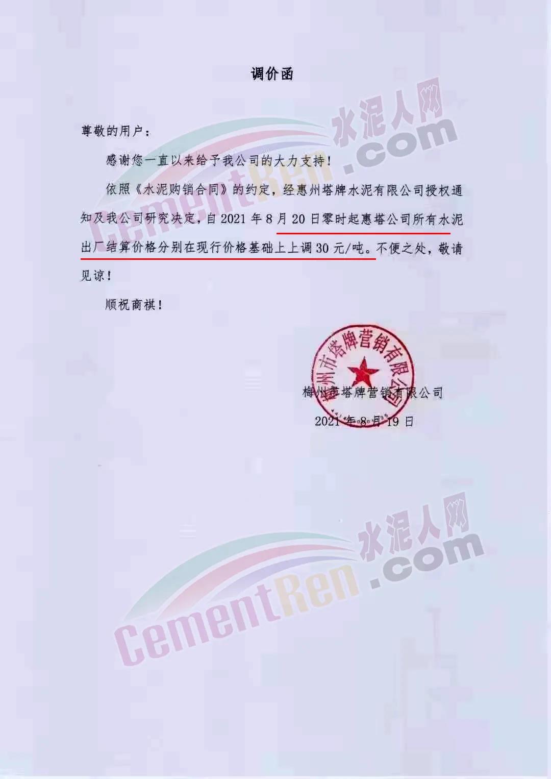 梅州市塔牌營銷公司通知自8月20日零時起惠塔公司所有水泥出廠結算價格分別在現行價格基礎上上調30元/噸。