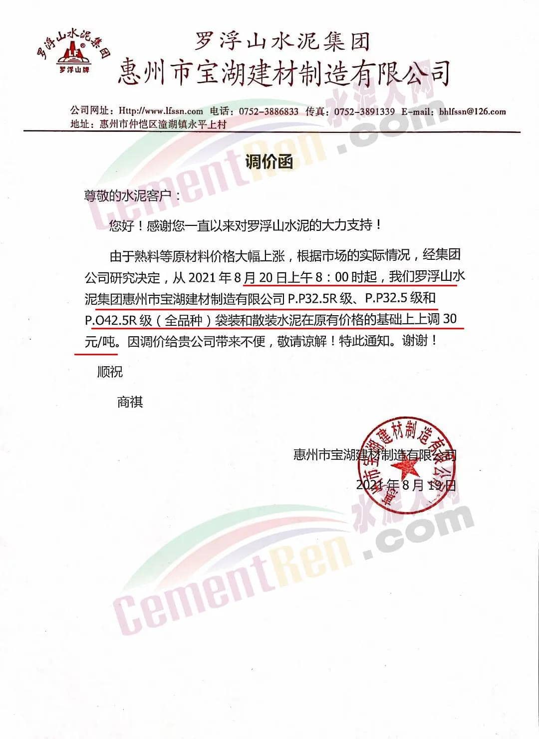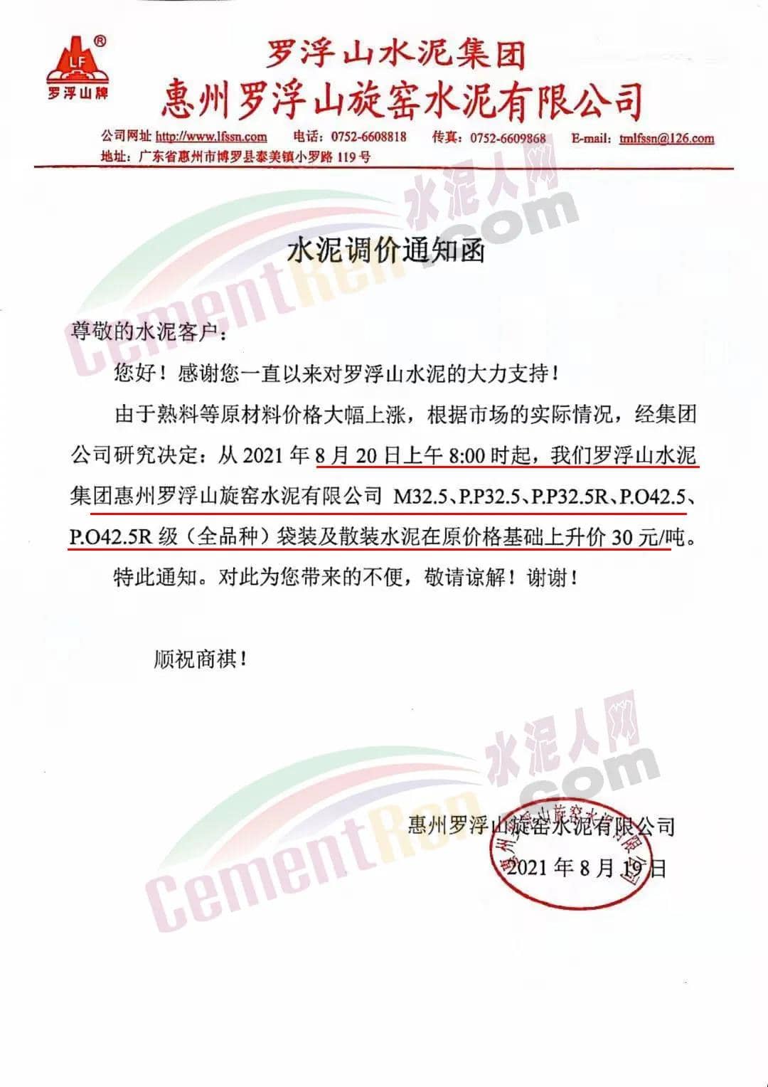 羅浮山水泥集團惠州羅浮山旋窯水泥有限公司通知,自8月20日上午8時起全品種袋裝及散裝水泥在原價基礎上升價30元/噸。