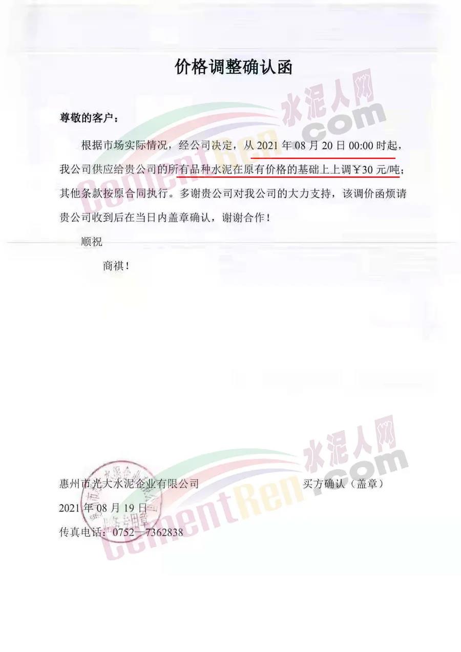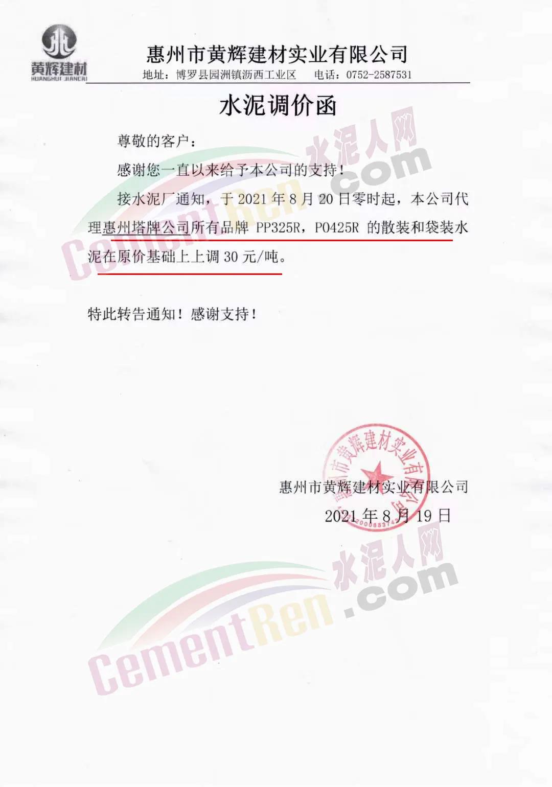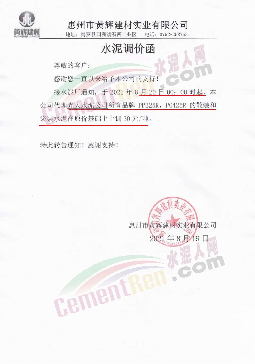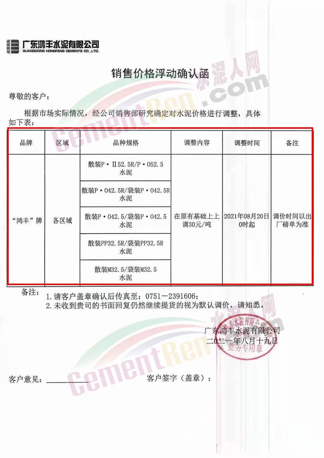 廣東鴻豐水泥有限公司通知,自8月20日0時起各標號水泥上調30元/噸。