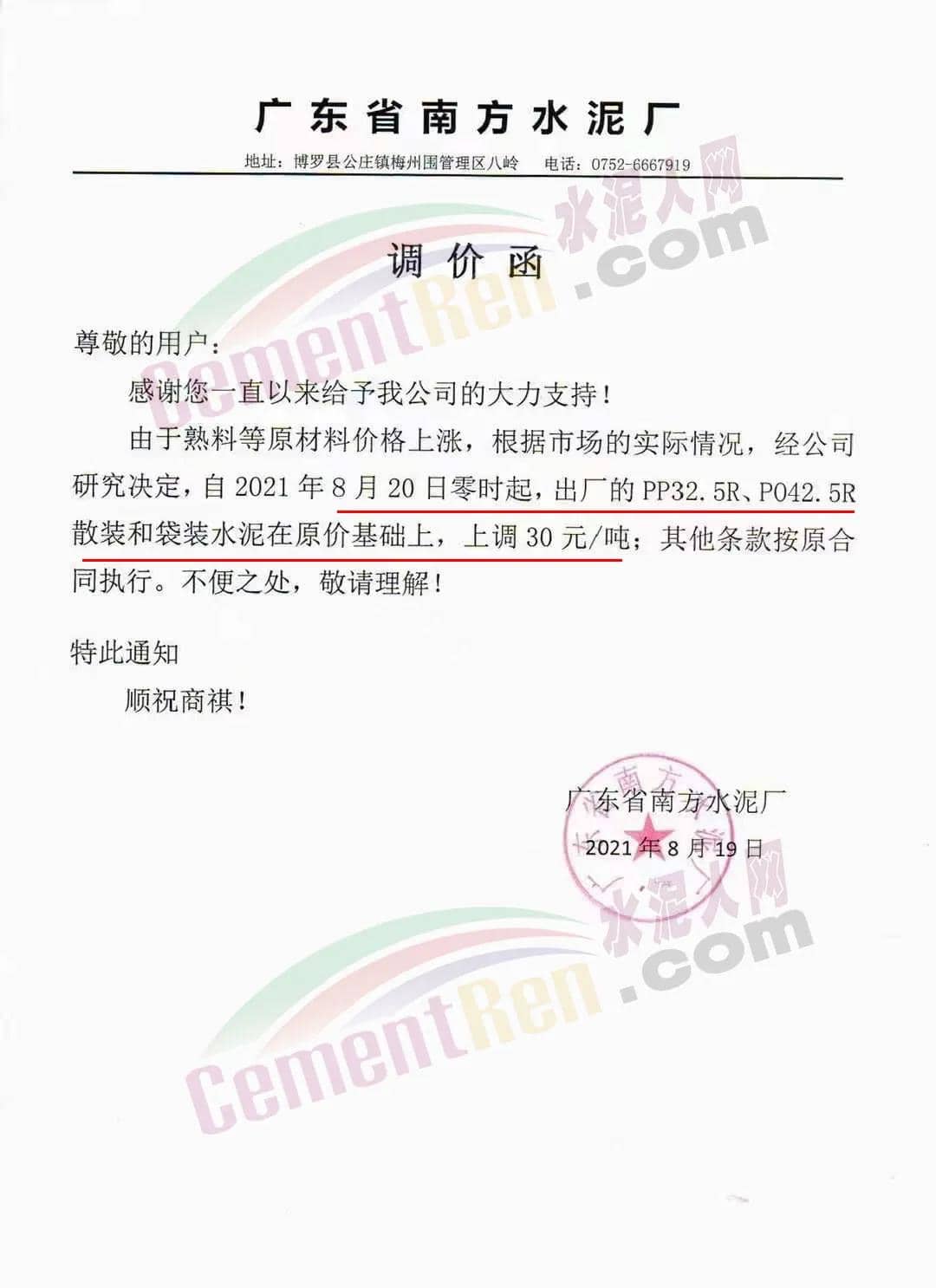 廣東省南方水泥廠通知,自8月20日零時起,各標號水泥上調30元/噸。