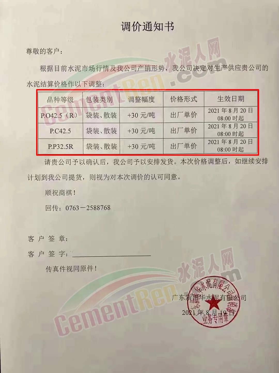 廣東新南華水泥有限公司通知,自8月20日8時起各標號水泥上調30元/噸。