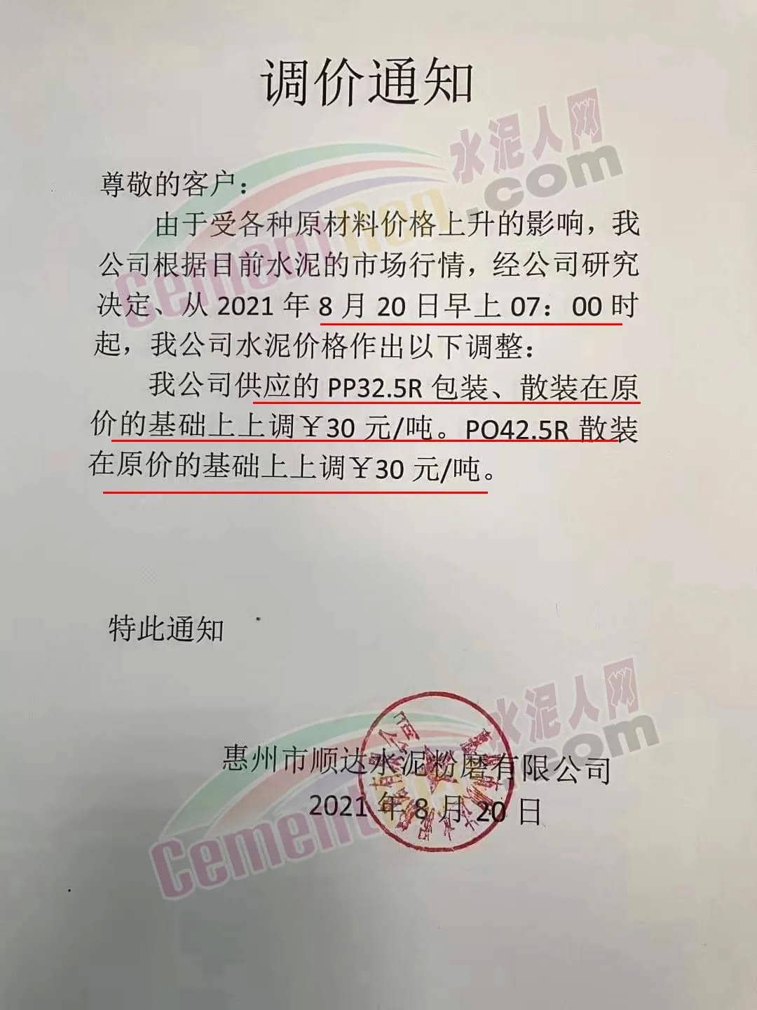 惠州市順達水泥粉磨有限公司通知,自8月20日早7時起,旗下各標號水泥上調30元/噸。