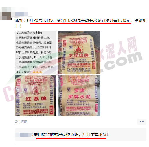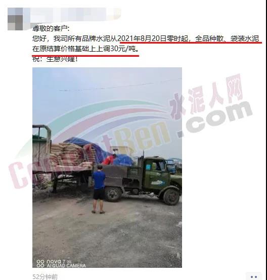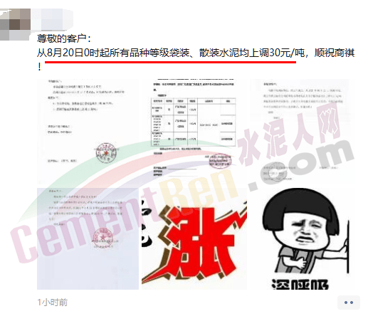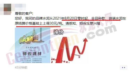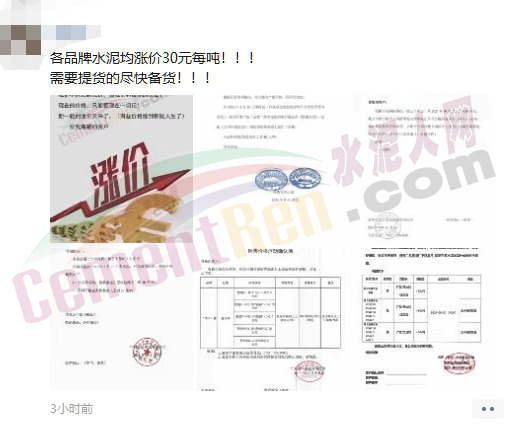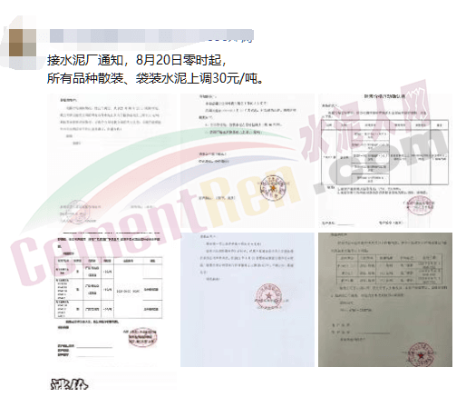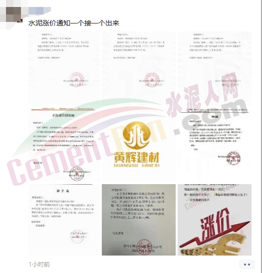 區域內各品牌水泥旗下代理商經銷商也紛紛發布通知,以告知客戶相關調價信息。