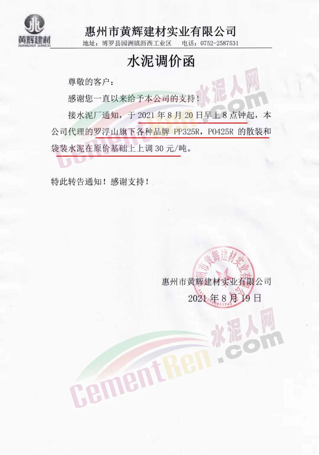 博羅縣園洲羅浮山水泥有限公司通知自8月20日上午8時起,全品種水泥袋裝和散裝在原價格基礎上上調30元/噸。
