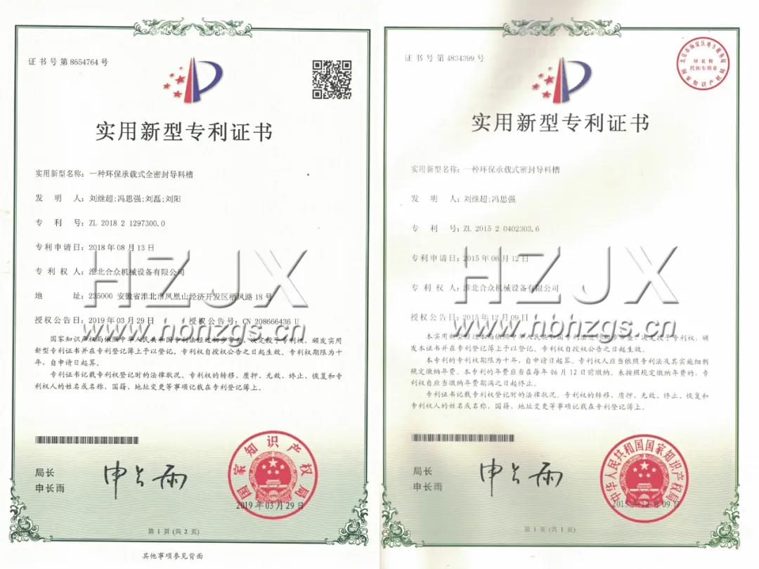 此外,作為一家專注于智能環(huán)保輸送裝備粉塵治理的綜合性企業(yè),淮北合眾一直以來非常重視技術創(chuàng)新,其自主研發(fā)的“環(huán)保承載式全密封導料槽”榮獲由國家知識產權局頒發(fā)的兩項實用新型專利。