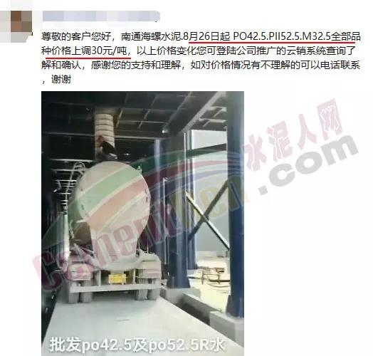江蘇南通海螺通知,自8月26日起PO42.5、PII52.5、M32.5全部品種價(jià)格上調(diào)30元/噸。