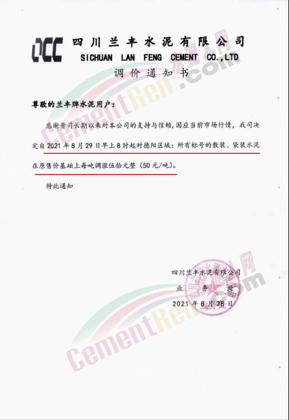 四川蘭豐水泥有限公司通知稱,自8月29日8時起對德陽區域所有標號的散裝、袋裝水泥在原售價基礎上調漲50元/噸。