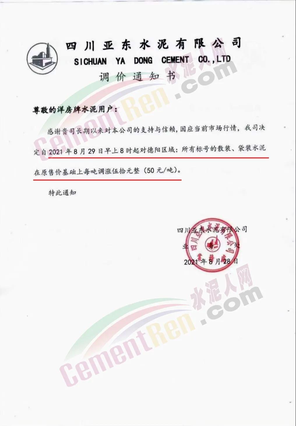 四川亞東水泥通知,自8月29日8時起,對德陽區域所有標號的散裝、袋裝水泥在原售價基礎上調漲50元/噸。