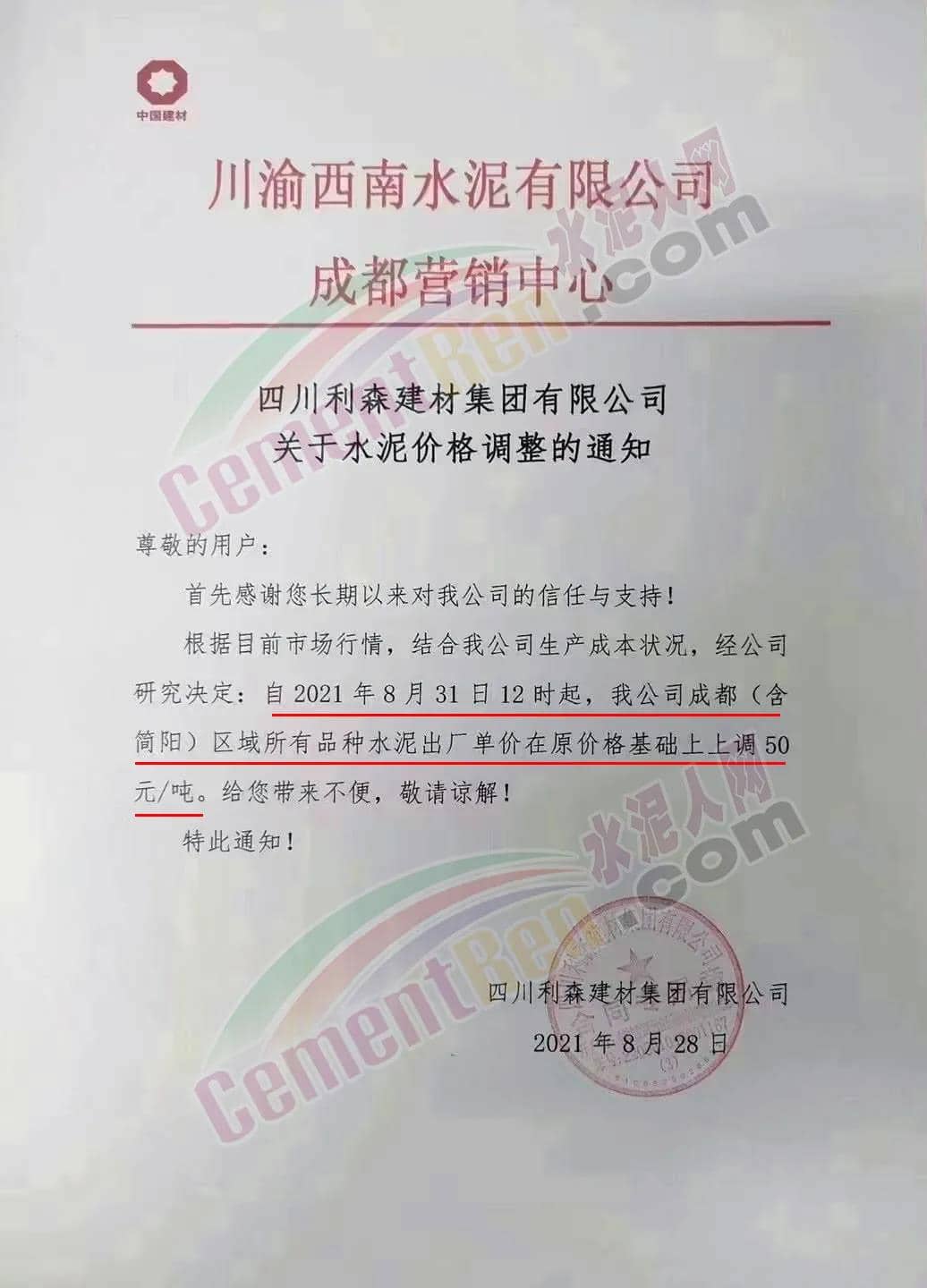 安縣中聯水泥、崇州西南水泥、四川德勝集團、峨眉山西南水泥、四川利森集團、綿竹澳東水泥、女媧建材等通知稱,根據目前市場行情 ,結合公司生產成本狀態,經公司研究決定自8月31日12時起,成都(含簡陽)區域所有品牌水泥出廠單價在原價基礎上上調50元/噸。