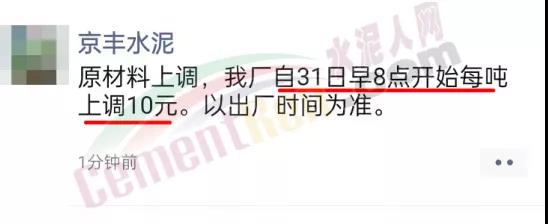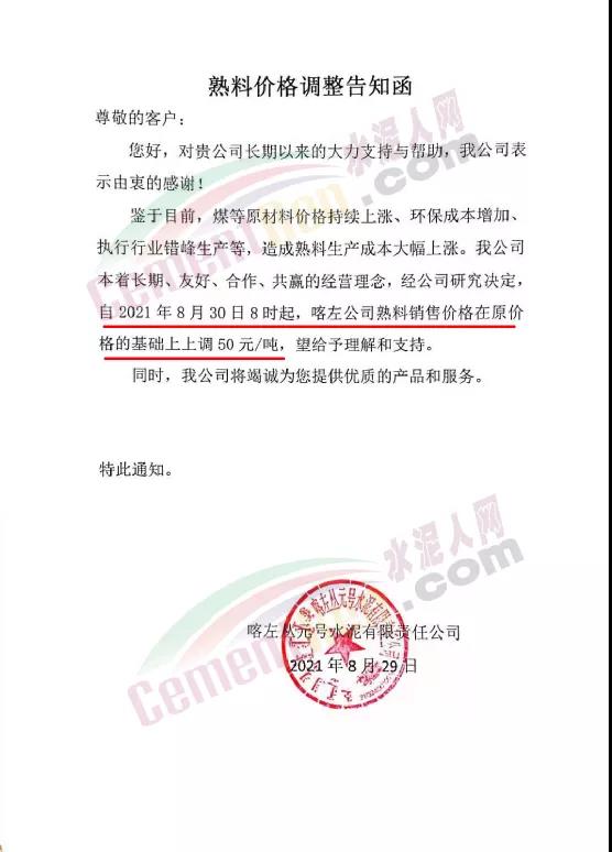 同日,廣東省湛江市遂溪縣金海實業有限公司通知,據根當前公司進料、庫存及市場情況,經研究決定從2021年8月31日零時起,本廠生產的各品牌各品種水泥,在原價格基礎上上調20元/噸。