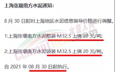 8月30日上海地區主流品牌P.C42.5、M32.5水泥價格上漲20元/噸,通知稱因原料供應緊張,成本持續增加,加之下游需求好轉,因此水泥價格再次推漲。