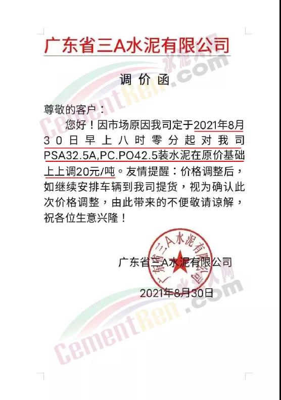 同期,廣東省三A水泥有限公司通知,因市場原因公司定于2021年8月30日早上八時零分起對公司PSA32.5A,PC42.5、PO42.5裝裝水泥在原價基礎上上調20元/噸。