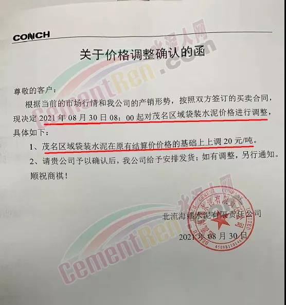 北流海螺水泥通知,根據當前的市場行情和公司的產銷形勢,按照雙方簽訂的買賣合同,決定自2021年8月30日8時起對茂名區域袋裝水泥結算價上調20元/噸。