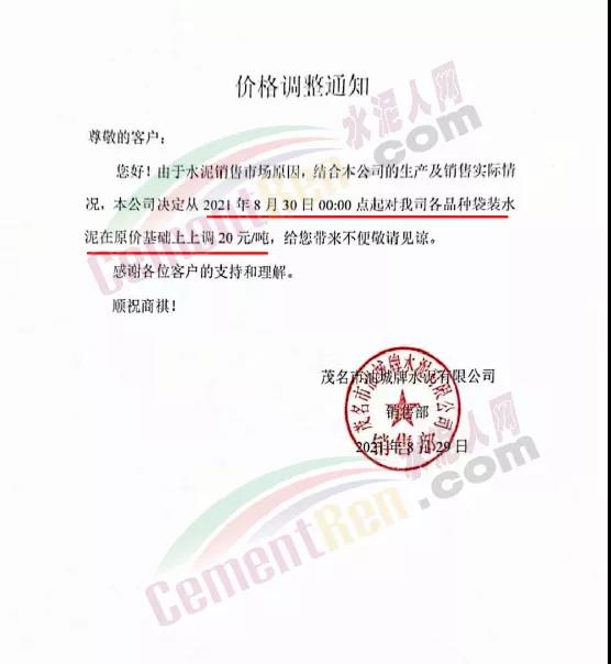 茂名市油城牌水泥有限公司通知,由于水泥銷售市場原因,結合公司的生產及銷售實際情況,本公司決定從2021年8月30日零時起對各品種袋裝水泥在原價基礎上上調20元/噸。
