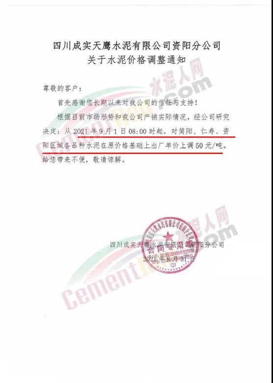 四川成實天鷹水泥有限公司資陽分公司通知根據目前市場形勢和公司產銷實際情況,經公司研究決定從2021年9月1日8時起,對簡陽、仁壽、資陽區域各品種水泥在原價格基礎上出廠單價上調50元/噸。