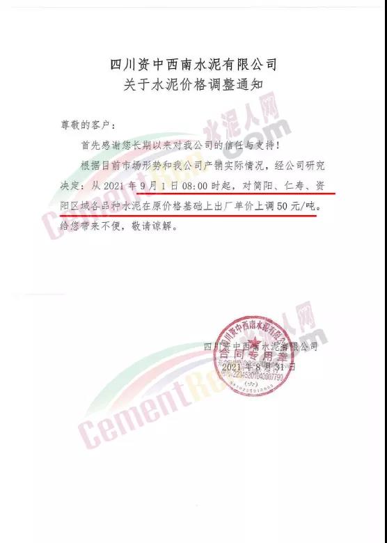 四川資中西南水泥有限公司通知根據目前市場形勢和公司產銷實際情況,經公司研究決定,從9月1日8時起,對簡陽、仁壽、資陽區域各品種水泥在原價格基礎上出廠單價上調50元/噸。