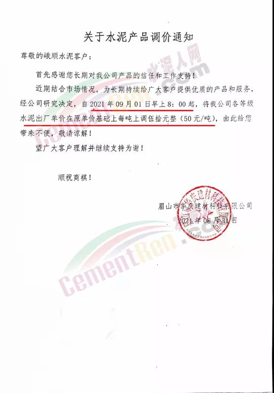 眉山市華慶建材科技有限公司通知結合市場情況,為長期持續給廣大客戶提供優質的產品和服務,經公司研究決定,自2021年9月1日8時起,將公司各等級水泥出廠單價在原單價基礎上上調50元/噸。