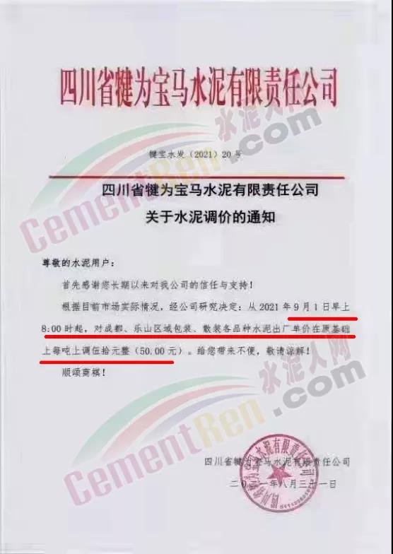 四川省犍為寶馬水泥有限責任公司通知,自9月1日早8時起,對成都、樂山區域包裝、散裝水泥出廠單價在原基礎上上調50元/噸。