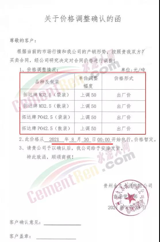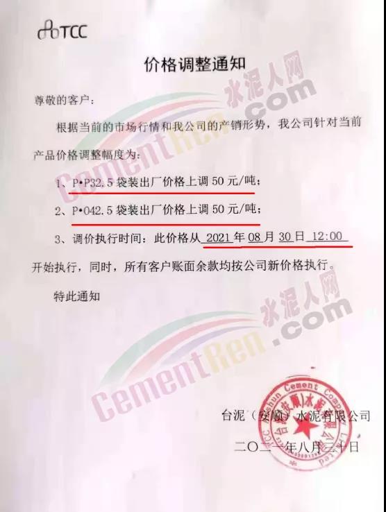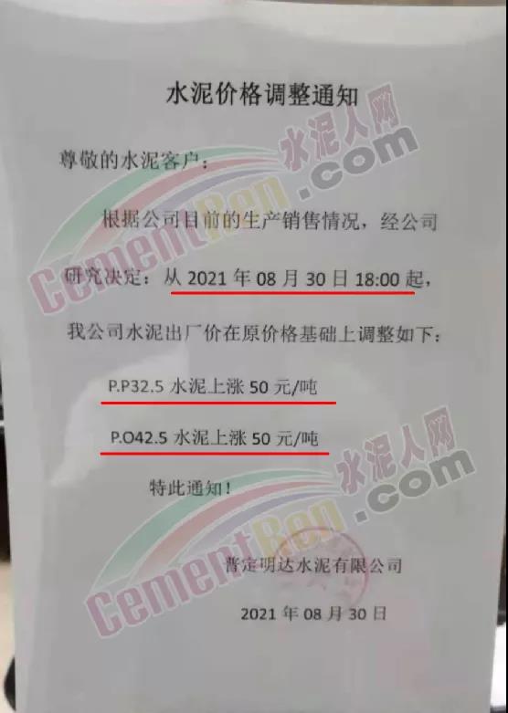 貴州省安順市普定縣普定明達水泥有限公司通知根據公司目前的生產銷售情況,經公司研究決定從2021年8月30日18時起,公司水泥出廠價在原價格基礎上P.P32.5水泥上漲50元/噸,P.O42.5水泥上漲50元/噸。
