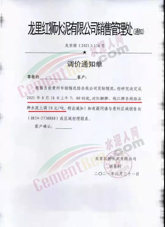 龍里紅獅水有限公司通知,根據當前貴州市場情況結合公司實際情況,經研究決定從2021年8月31日上午7時起,對紅獅牌、錢江牌各規格品種水泥上調50元/噸。