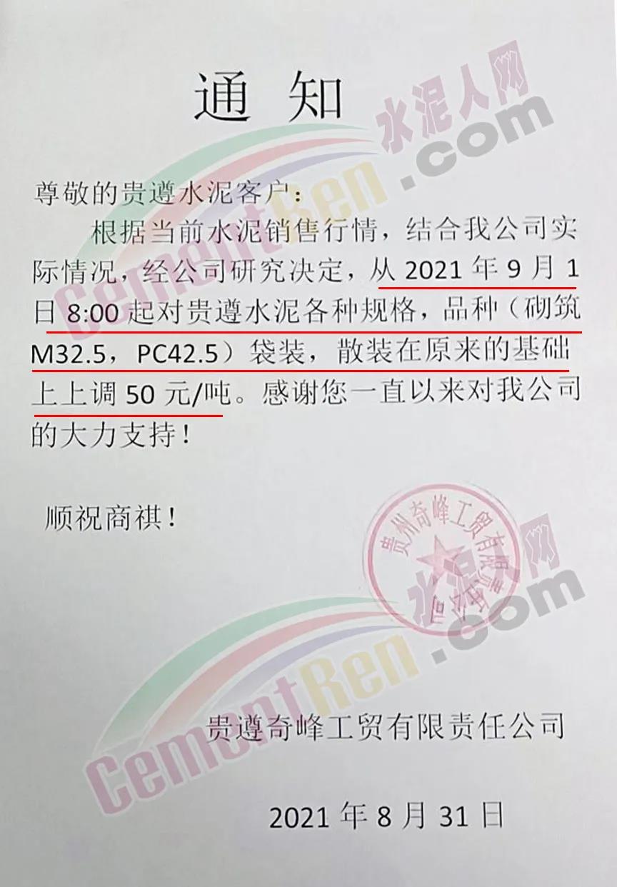 貴遵奇峰工貿有限責任公司通知,根據當前水泥銷售行情,結合公司實際情 況,經公司研究決定,從2021年9月1日8時起對貴遵水泥各規格品種(砌筑M32.5、PC42.5)袋裝、散裝在原來的基礎上上調50元/噸。