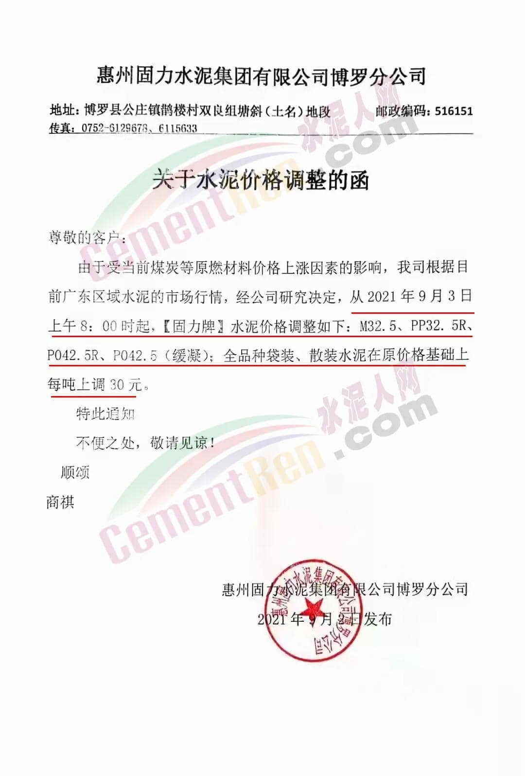 惠州固力水泥集團(tuán)有限公司分公司通知,受當(dāng)前煤炭等原燃材料價(jià)格上漲因素的影響,公司根據(jù)目前廣東區(qū)域水泥的市場(chǎng)行情決定,從2021年9月3日上午8時(shí)起,“固力牌”M32.5、PP32.5R、PO42.5R、PO42.5(緩凝);全品種袋裝、散裝水泥在原價(jià)格基礎(chǔ)上上調(diào)30元/噸。