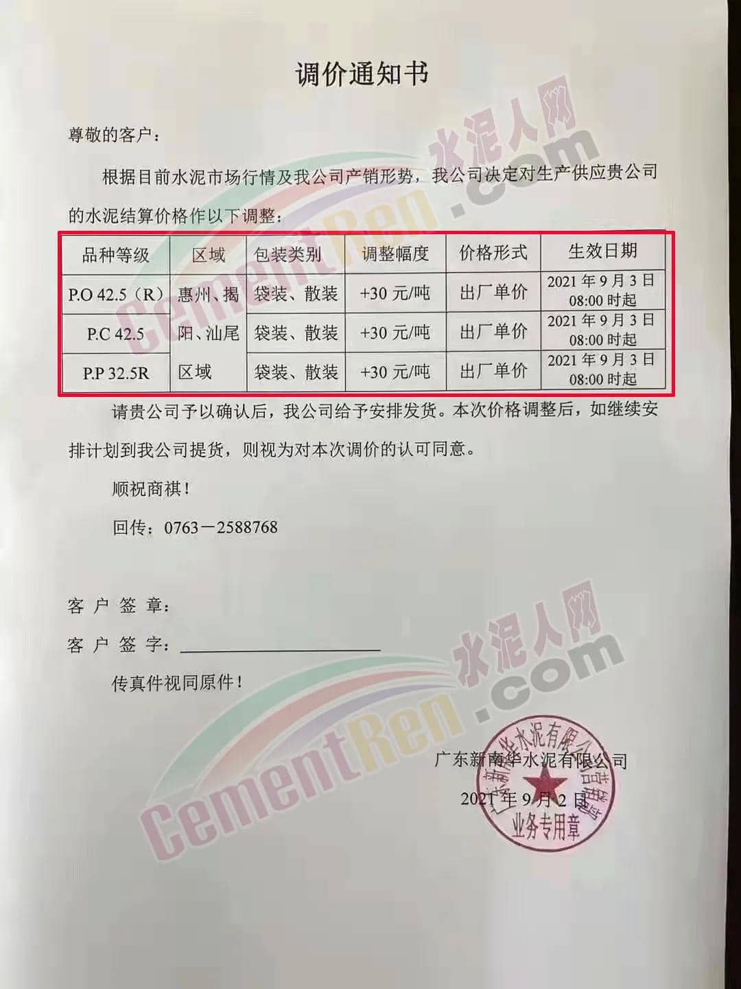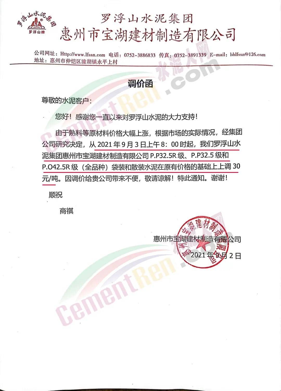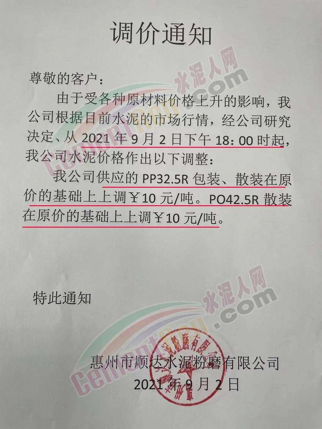 由于受各種原材料價(jià)格上升的影響,公司根據(jù)目前水泥的市場(chǎng)行情,經(jīng)研究決定從2021年9月2日下午18時(shí)起,公司供應(yīng)的PP32.5R包裝、散裝在原價(jià)的基礎(chǔ)上上調(diào)10元/噸。PO42.5R散裝在原價(jià)的基礎(chǔ)上上調(diào)10元/噸。
