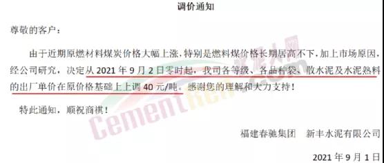 福建春馳集團(tuán)新豐水泥有限公司通知由于近期原燃材料煤炭?jī)r(jià)格大幅上漲,特別是燃料煤價(jià)格長(zhǎng)期居高不下,加上市場(chǎng)原因,經(jīng)公司研究,決定從2021年9月2日零時(shí)起,公司各等級(jí)、各品種袋、散水泥及水泥熟料的出廠單價(jià)在原價(jià)格基礎(chǔ)上上調(diào)40元/噸。