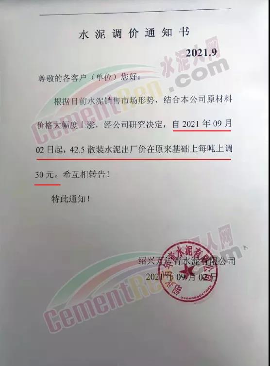 紹興萬(wàn)年青水泥通知根據(jù)目前水泥銷售市場(chǎng)形勢(shì),結(jié)合本公司原材料價(jià)格大幅度上漲,經(jīng)公司研究決定,自2021年9月2日起,42.5散裝水泥出廠價(jià)在原來(lái)基礎(chǔ)上每噸上調(diào)30元。