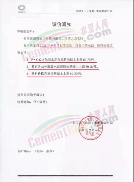 9月7日中材天山(珠海)水泥有限公司對水泥、熟料價格上調50-60元/噸。