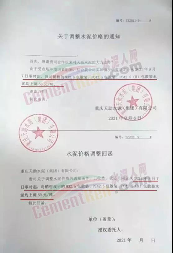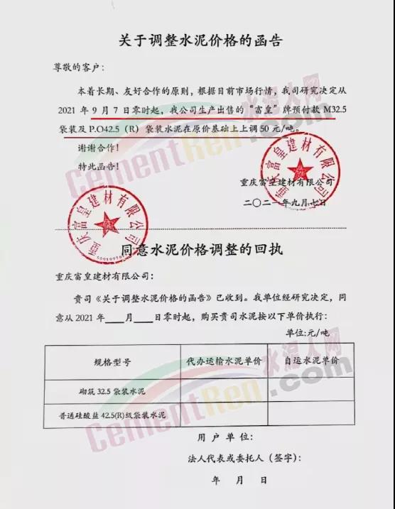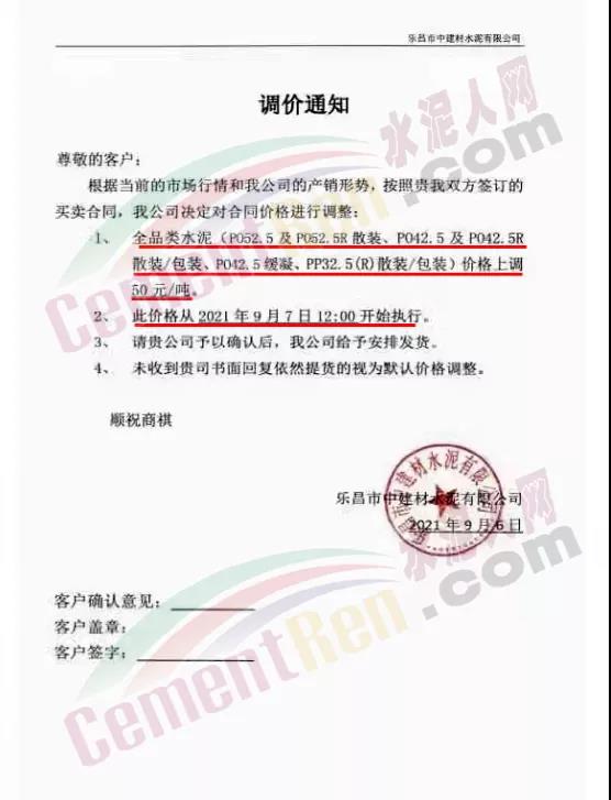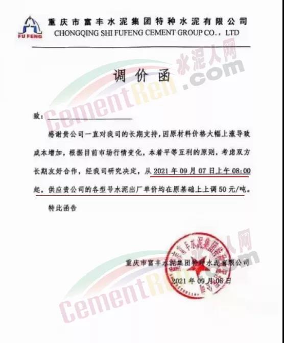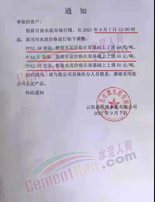 9月7日四川億鑫聯水泥有限公司各型號規格水泥上調50元/噸。