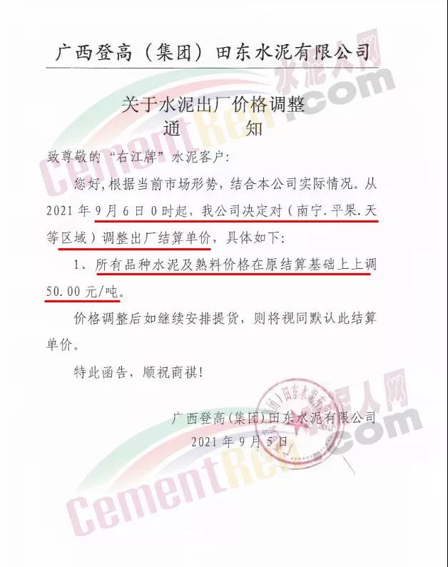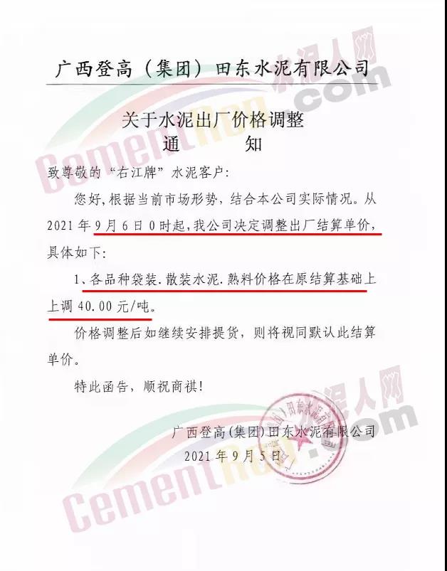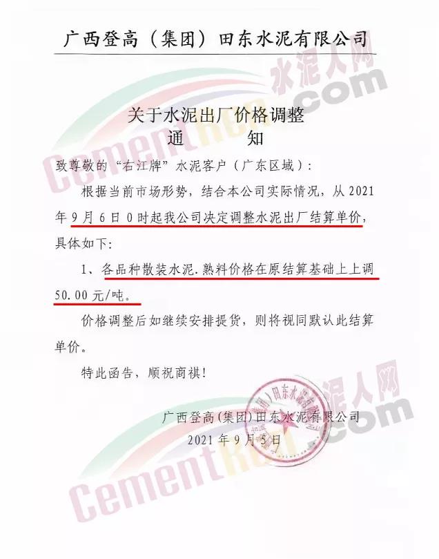 9月6日廣西登高(集團)田東水泥有限公司上調廣東區域“右江牌”散裝水泥、熟料價格50元/噸。