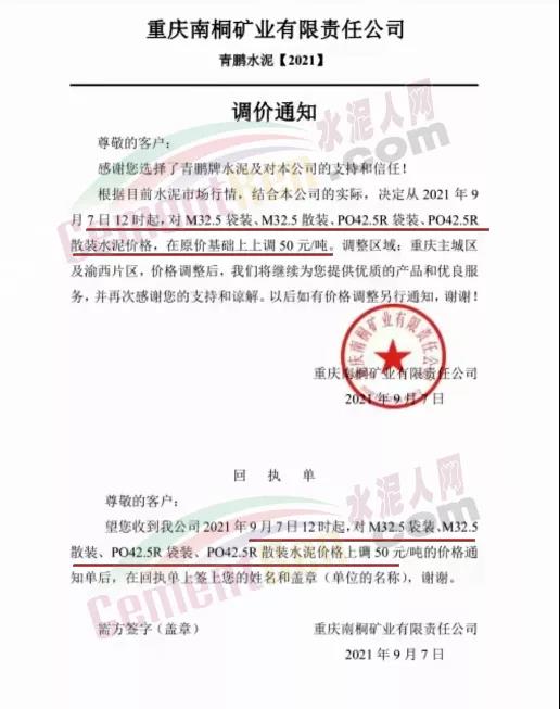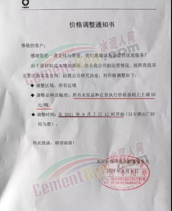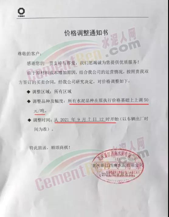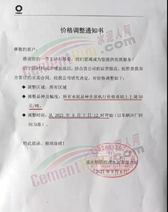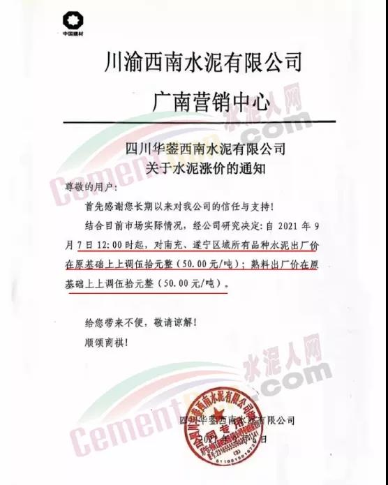 9月7日重慶綦江西南水泥、長壽西南水泥、臺泥重慶公司等9家企業通知上調各標號水泥價格50元/噸