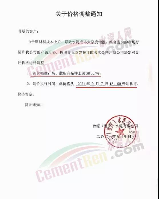 9月5日臺泥(貴港)水泥有限公司對全廣西區域的全品項水泥價格上調50元/噸。