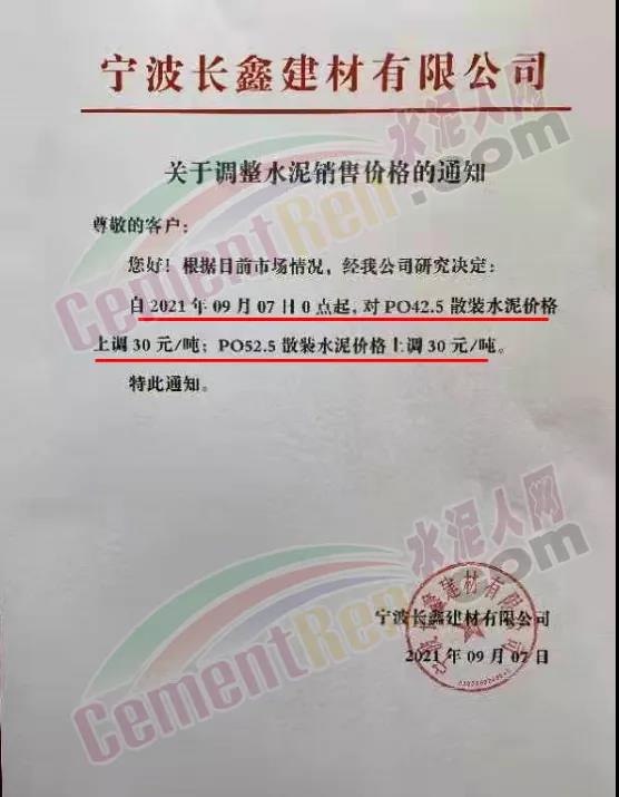 9月7日寧波長鑫建材有限公司PO42.5散裝水泥價格上調30元/噸,PO52.5散裝水泥上調30元/噸。