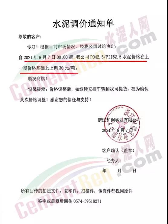 9月7日華東區域貿易商浙江和創實業有限公司通知PO42.5和PII52.5水泥上調30元/噸。