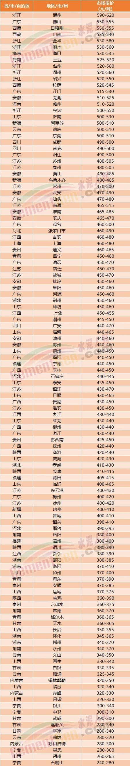 水泥人網信息中心數據顯示,水泥價格經過本輪調整,各區域水泥價格均出現不同幅度的上漲,其中浙江溫州部分地區PO42.5散裝水泥到位價已達620元/噸。浙江麗水、金華、臺州、湖州、紹興等多區域PO42.5散裝水泥到位價已達550元/噸以上。廣東佛山地區PO42.5散裝水泥到位價已達555元/噸。